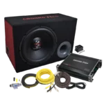 Bassreflex-Gehäuse mit 30 cm Subwoofer und Front-Basskanal, rot gesticktes Logo und Seitenwände, brückbarer 2-Kanal Verstärker