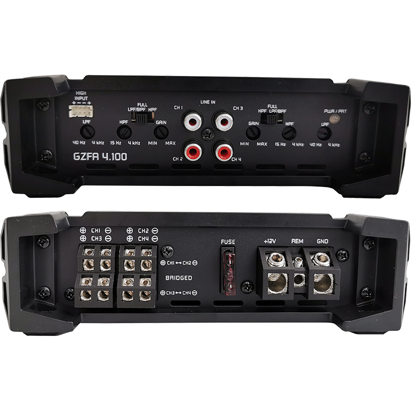 4-Kanal Verstärker mit Class A/B Schaltung, integrierter Aktivweiche und schwarz eloxiertem Kühlkörper