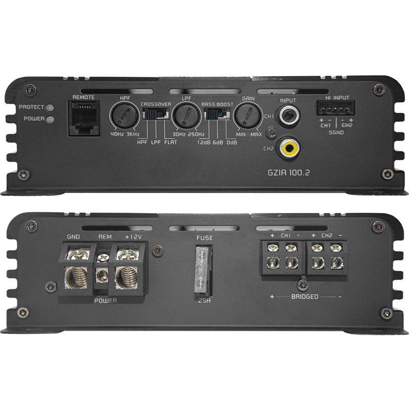 2-channel amplifier with class A/B circuit, integrated active crossover and black anodized heatsink